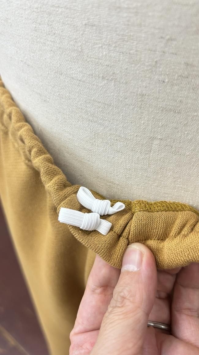 ウエストを調節できるよう、腰部分にゴムをつけています。結び直して調節を行えます。